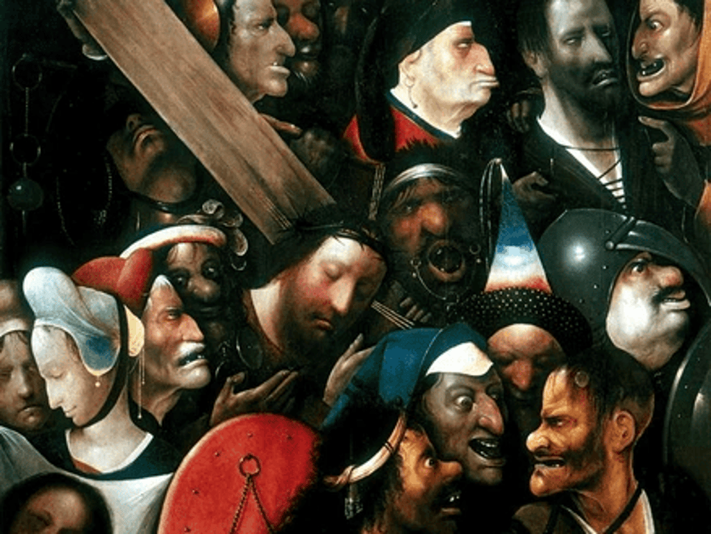 On a dark background, Jesus is depicted bearing his cross, surrounded by many heads, many of which have grotesque expressions. Veronica’s veil also has a portrait, bringing the total to nineteen. Jesus’ eyes are closed and his head is reclined in a sombre expression.